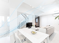 ルームエアコンで温度調節した空気が、循環ファンを通り室内に。家中、体に優しい快適な空間を創造します。