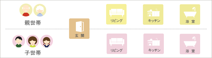 『ほどよく同居タイプ』共有玄関と水廻り(浴室・洗面)・食事