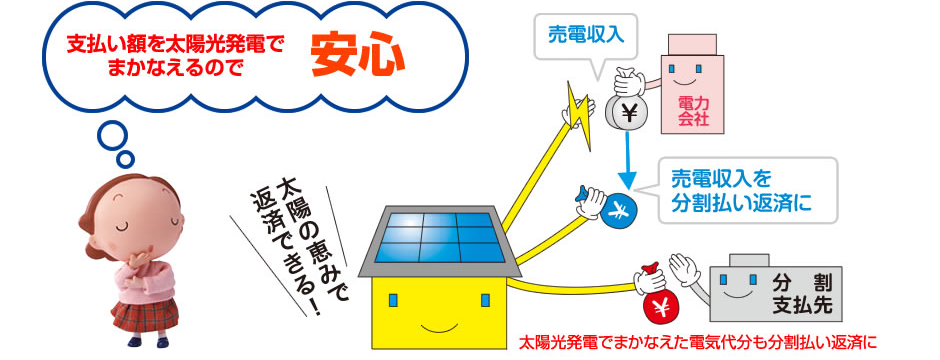 太陽光発電で得られた売電収入と自家消費削減分を分割払いに充当します。