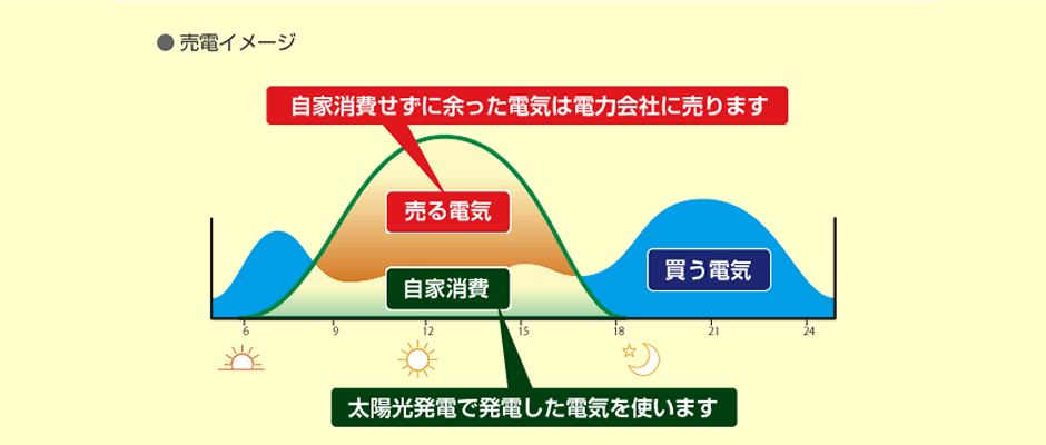 太陽光発電システムで発電した電気は優先的に自家消費にまわされ、余った電気を電力会社が一定価格で買い取ります。