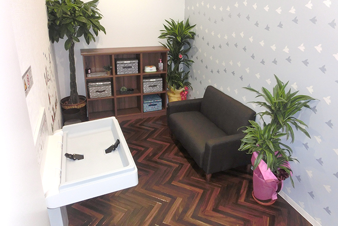 お打ち合わせ中も赤ちゃんと一緒のママが快適にお過ごし頂けるよう、おむつ交換のためのスペースも。ミルク用のお湯や交換用オムツもサイズ別にご用意しています。お気軽にスタッフまでお申しつけください。