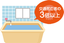 暖かい部屋から、浴室やトイレなどの寒い部屋に移動したとき、急激な温度差により血圧が変動し、脳出血や脳こうそく、心筋梗塞等を引き起こすきっかけとなります。このヒートショックでの死亡事故は、交通事故で亡くなる方の3倍に及ぶとも言われています。