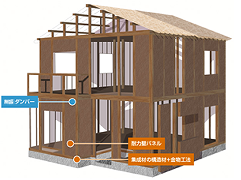 ムク材の約1.5倍の強さを持つ集成材の構造フレーム(軸組)に、外圧の影響を受けやすい接合部を金物工法でしっかり固定。その構造体に耐力壁の役割を果たすパネルをはめ込み接合させ、通常の木造住宅を超える耐震性を実現しました。