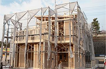 木造軸組み工法に、耐力壁としてのパネルを組み合わせ、軸材と軸材の間に耐力壁の役割を果たすパネルを張り付けるため、強度は一段と増し、地震や台風などによる外圧から建物をしっかり守ります。