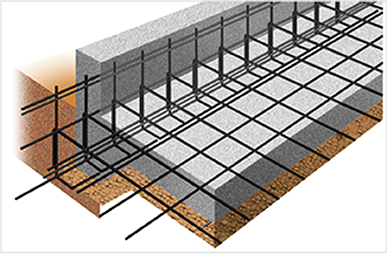 基礎ベース全体に鉄筋を一定間隔で縦横に配筋し、地面全体に強靱な壁を構築。基礎立ち上がり部分の配筋と一体化させることで、より強度を高め地震などの外力を地面に分散させます。
