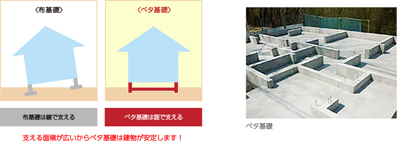 建物全体を面でどっしりと支える「鉄筋コンクリートベタ基礎工法」標準。