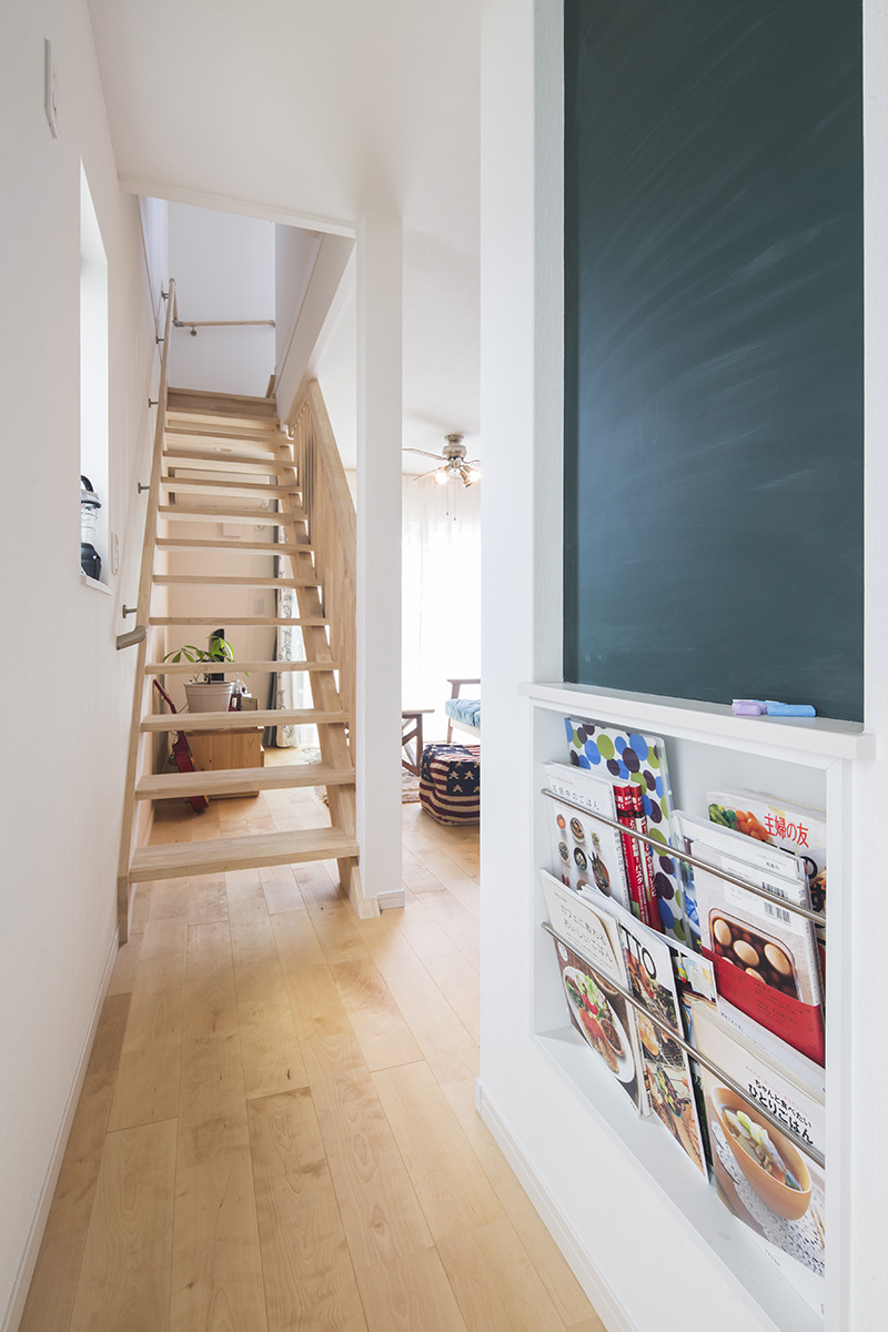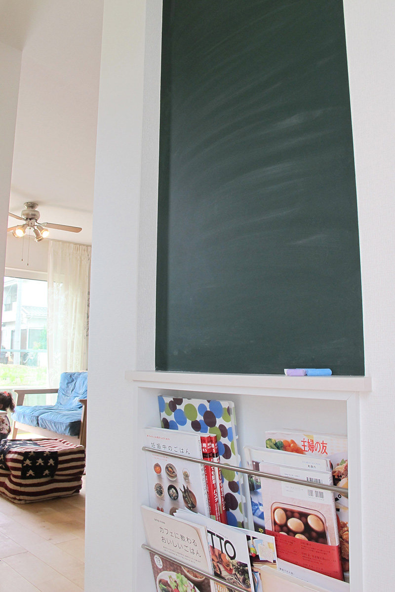 6. キッチンの壁面裏を利用して、ちょっとした本の収納に便利なブックシェルフと家族への伝言やお絵描きスペースになる黒板を設置。