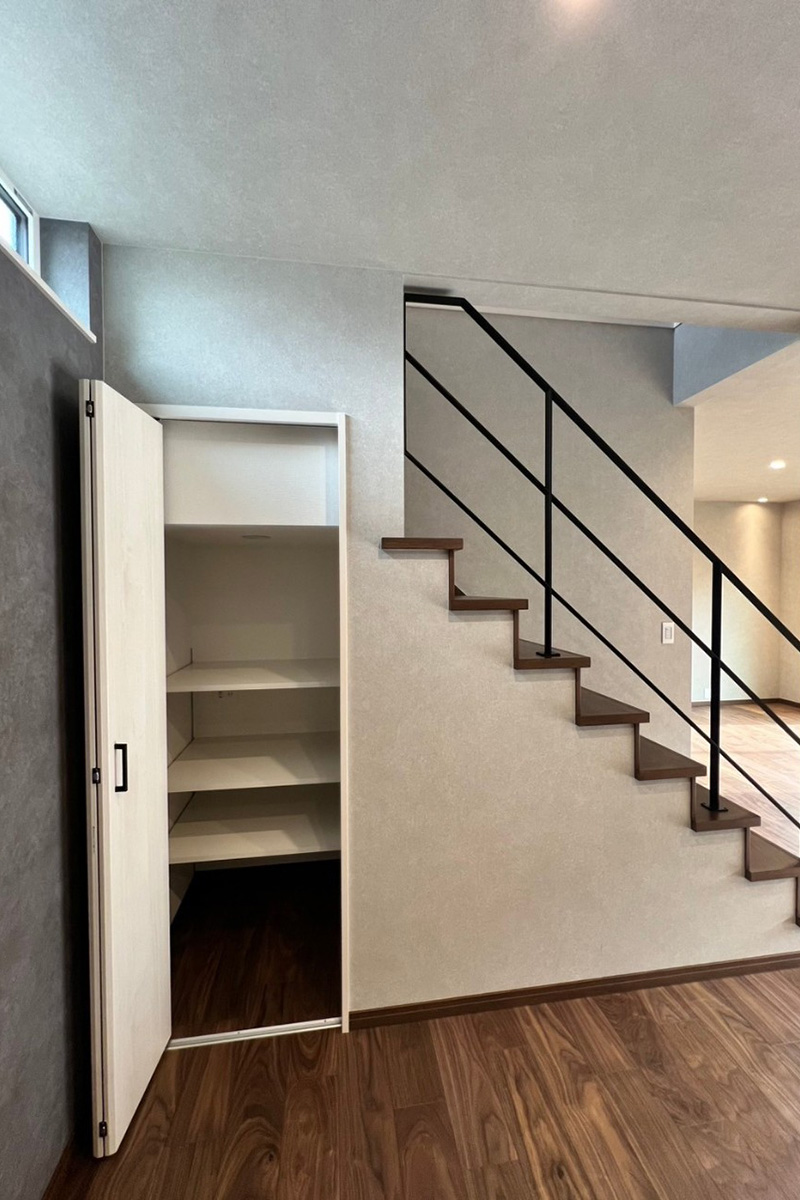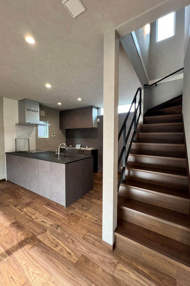 - 家族の繋がりを大切にできるリビング階段。階段の窓からは太陽の光がリビングへさしこみます。