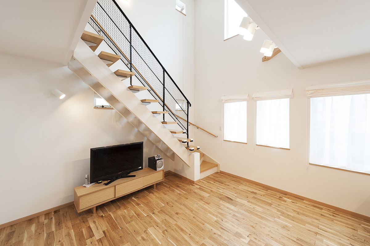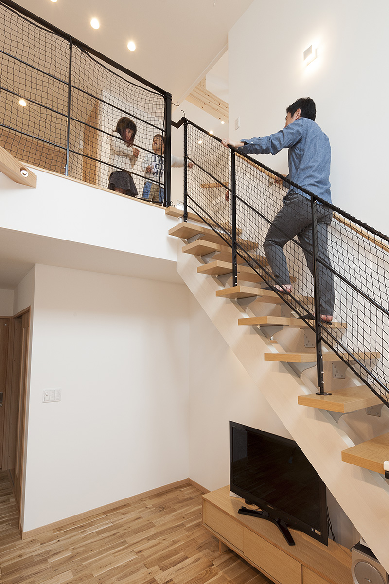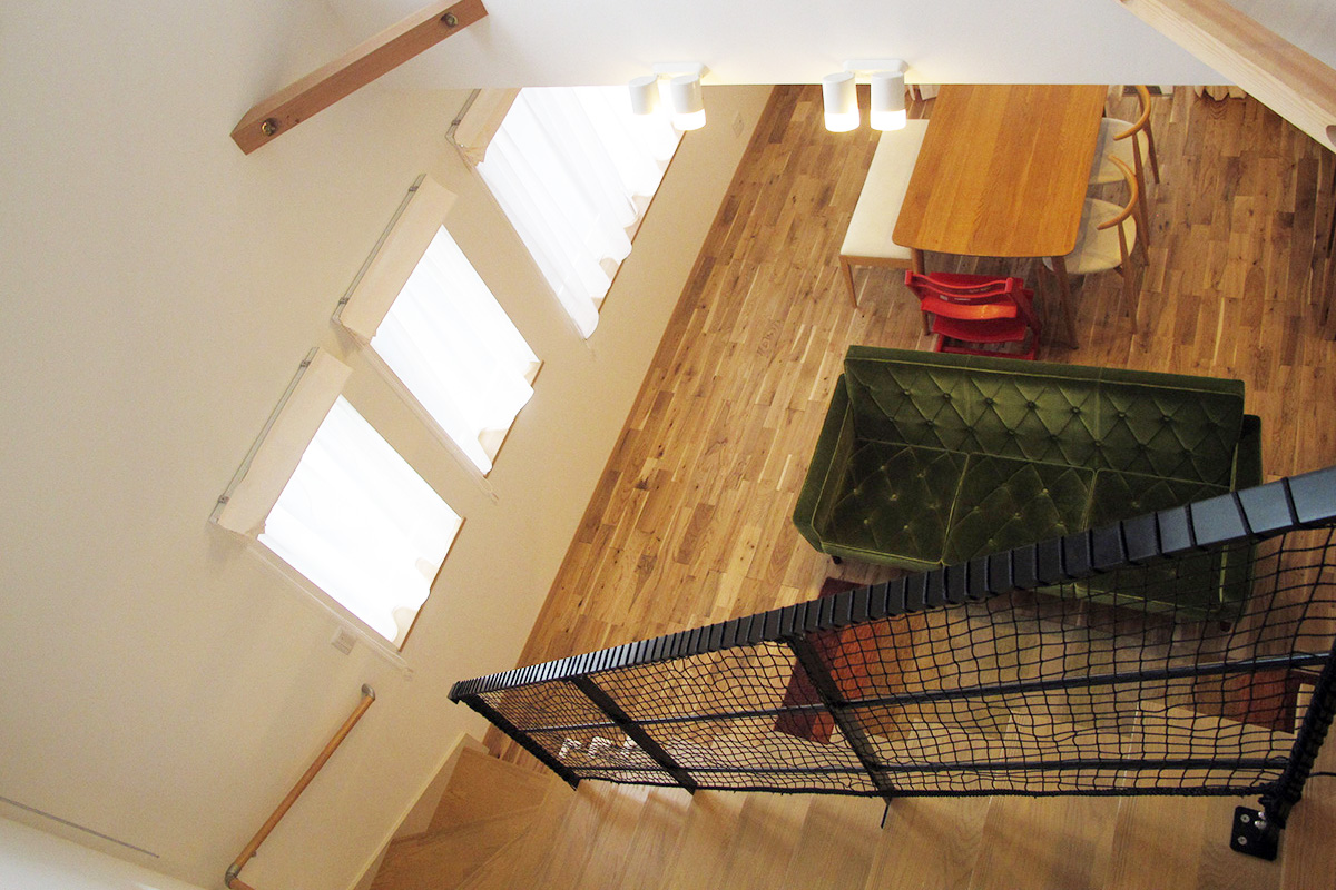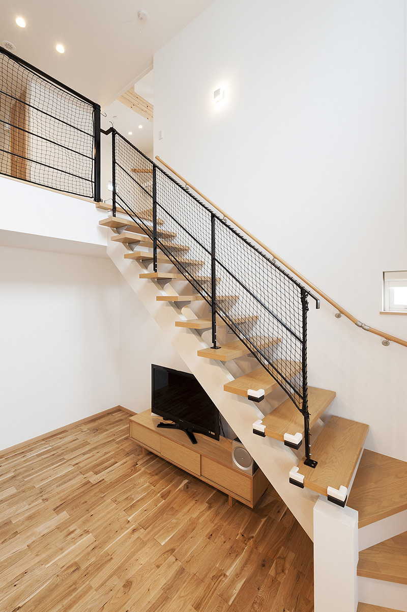 - リビング上部の大きな吹き抜けにはお洒落なオープン手すりを採用。2階で遊ぶお子様の様子もすぐに分かります。