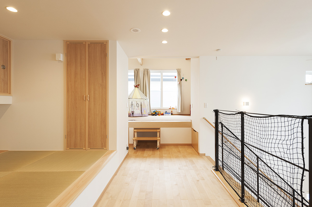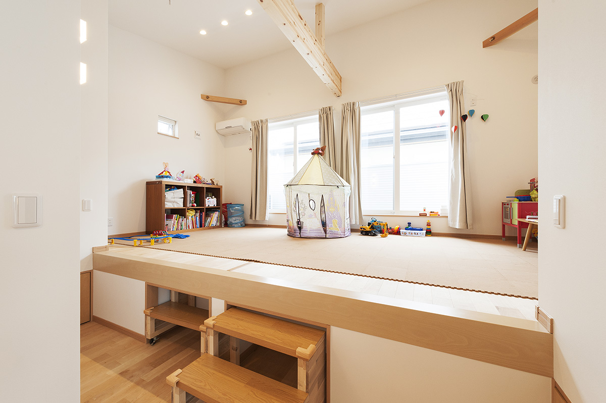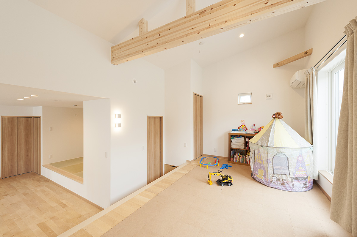 - 階下のガレージとの高低差を利用し、床下に大きな収納を設けたスキップフロアの子供部屋