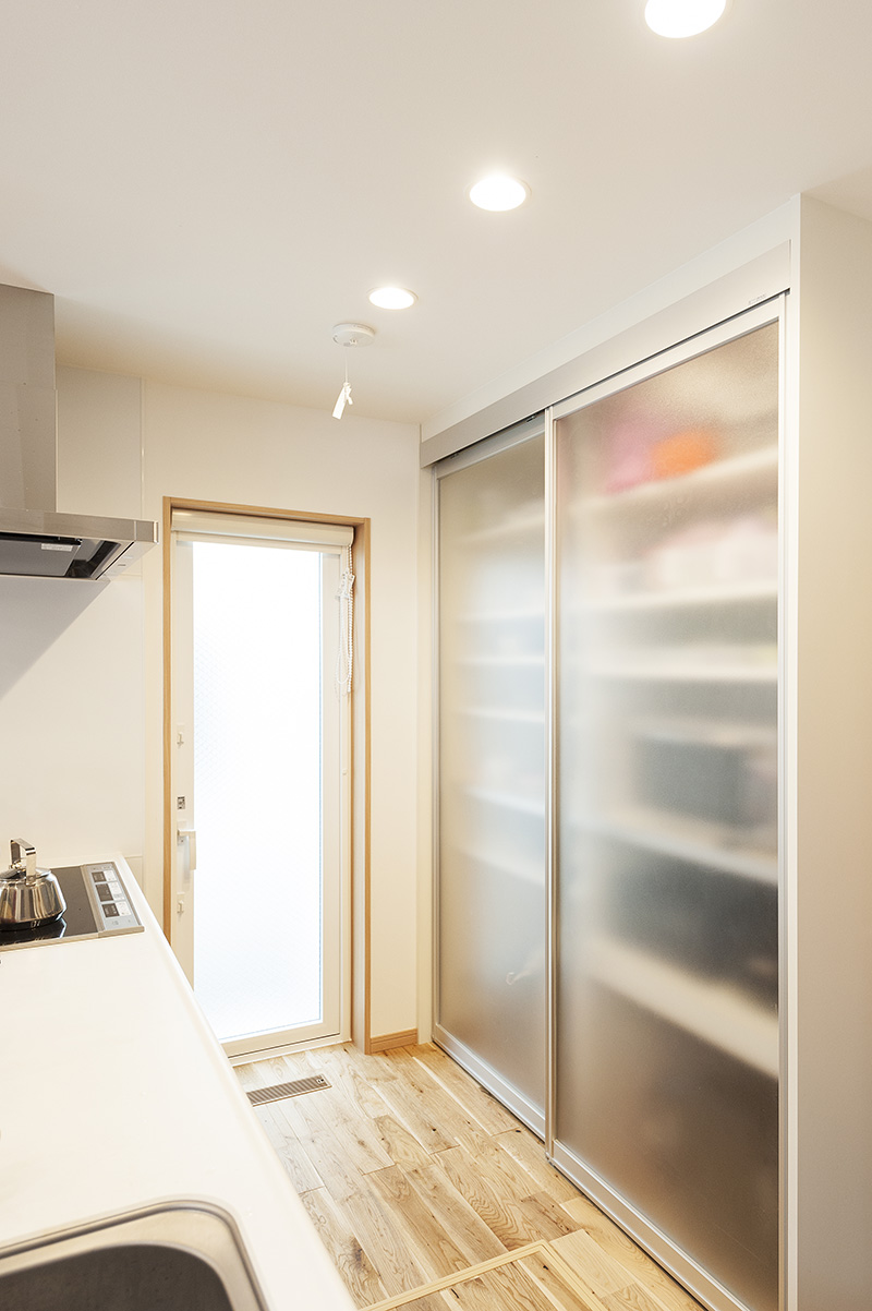 - キッチンにはパントリーを設けて収納力アップ。磨りガラスの引き戸で目隠し効果も。