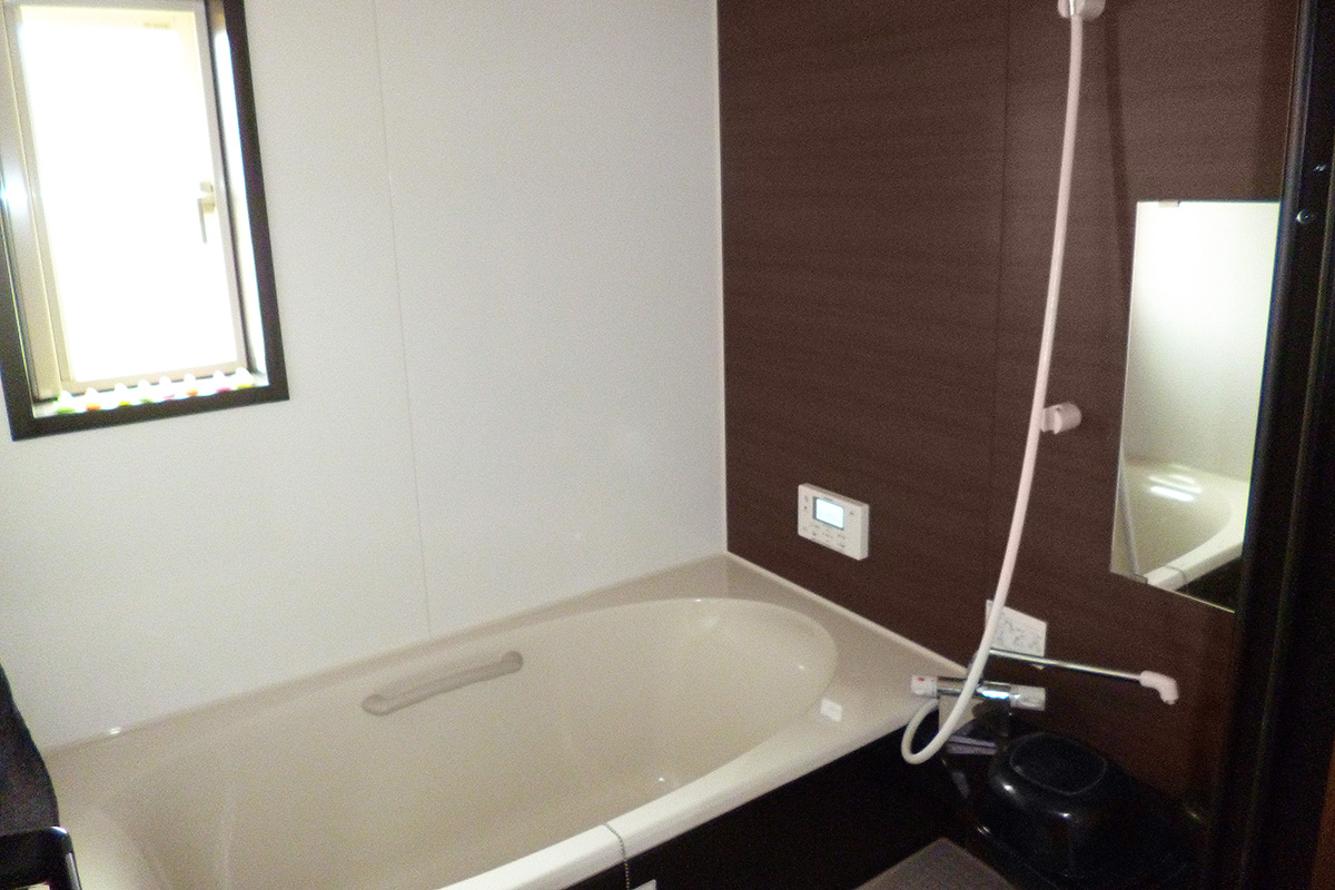 7. 木目調のアクセントクロスがお洒落な浴室