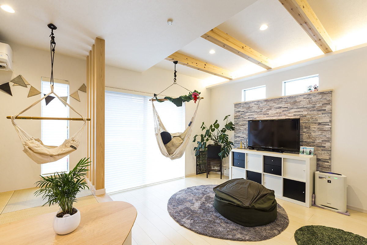 - 化粧梁×間接照明がおしゃれなリビング。温かみのある雰囲気とマッチし、より快適な空間になっています。