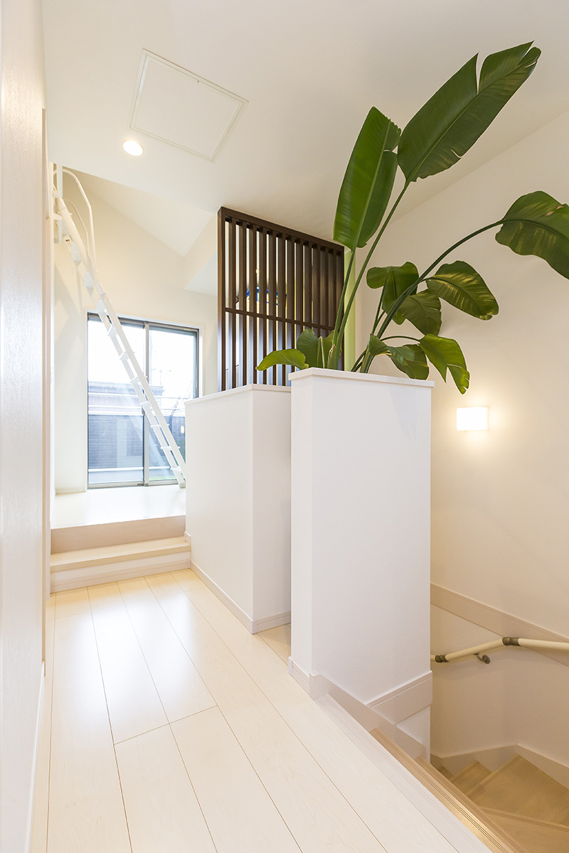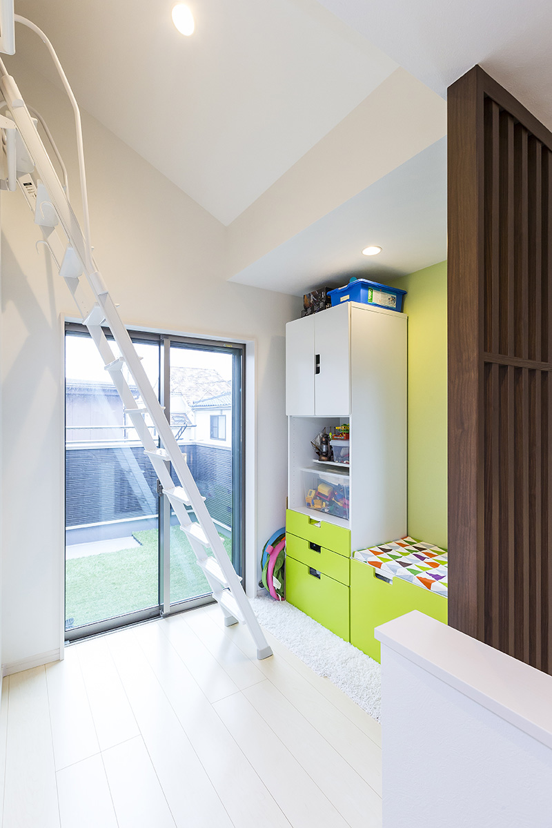 - 2階ホールにある小上がりで空間を仕切ったお子様の遊び場。バルコニーから光が差し込む心地よい空間です。