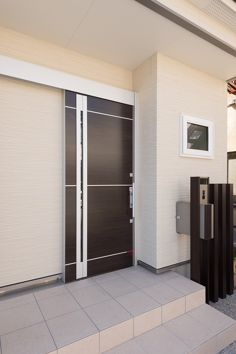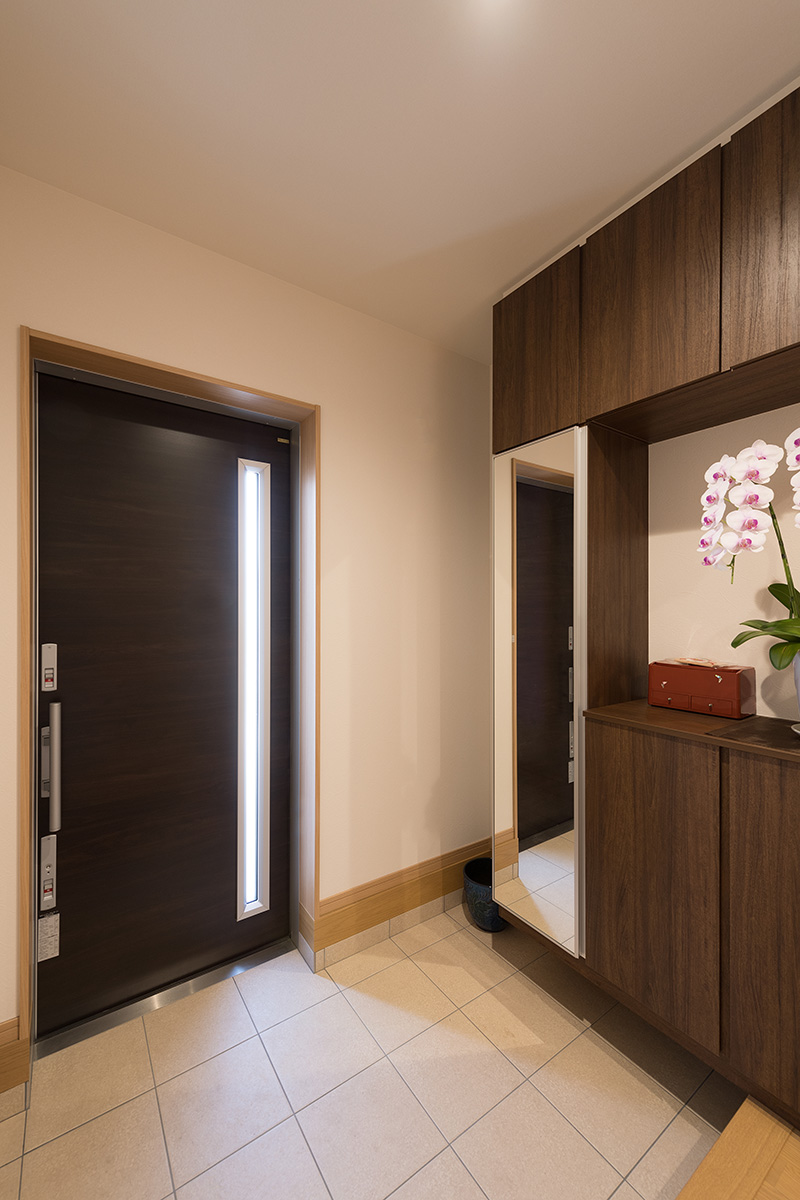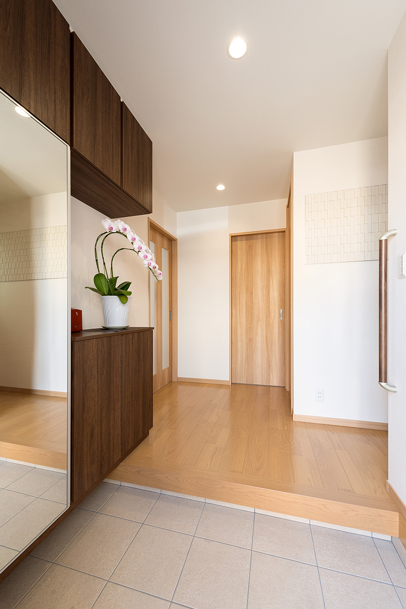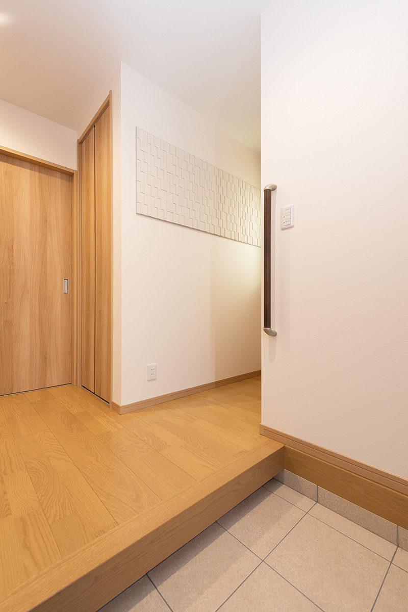 4. 消臭効果や調湿機能を持つエコカラットを玄関の壁面に採用。デザイン性があり空間のアクセントにも。
