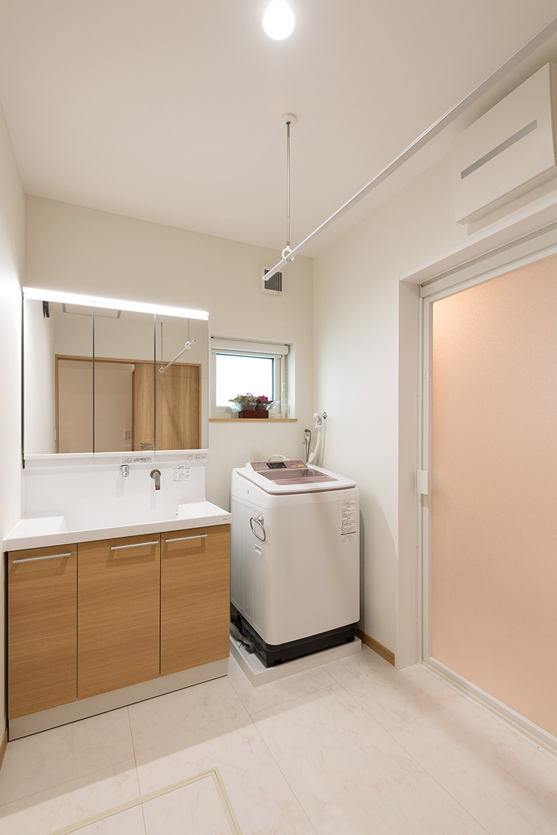 3. 広い洗面室には物干し金物を設置。室内干しでも早く乾く換気システムで梅雨や花粉の時期も安心です。