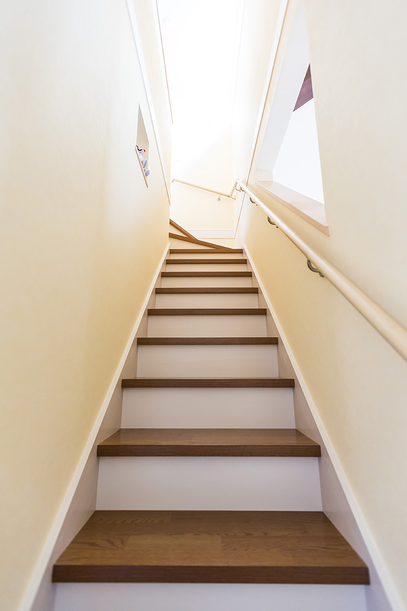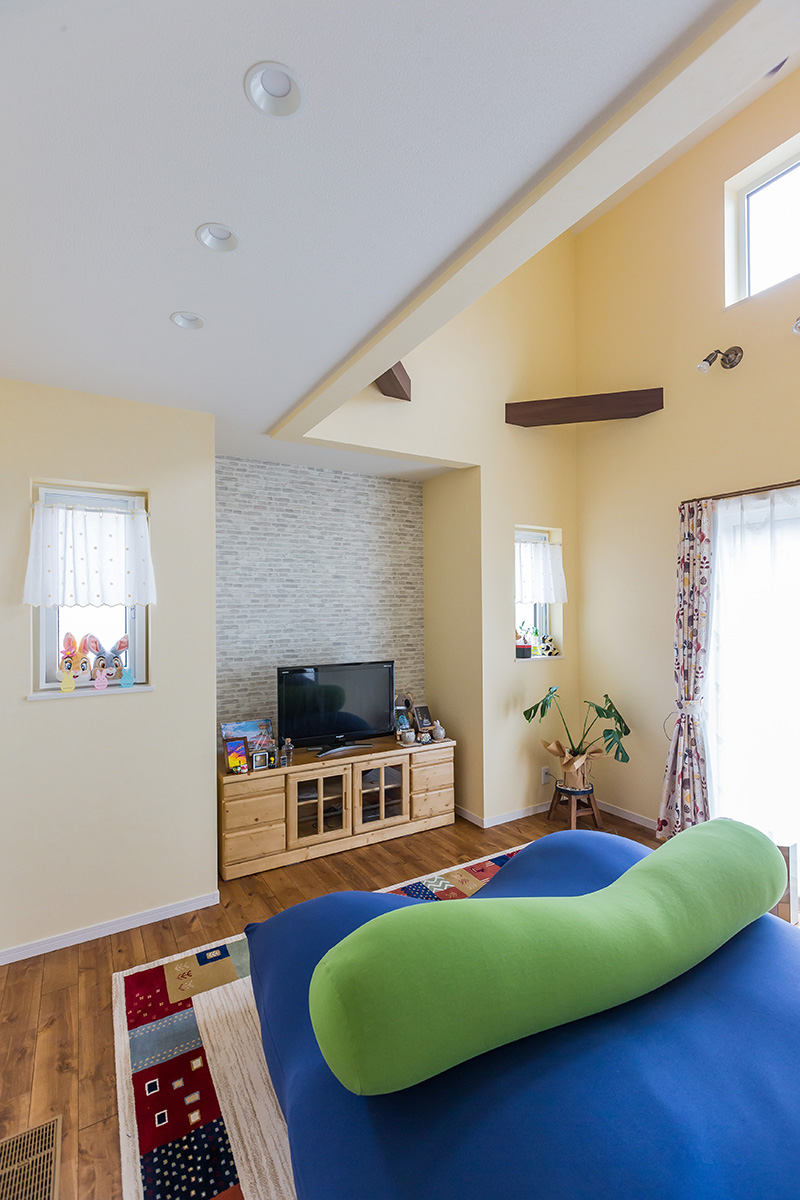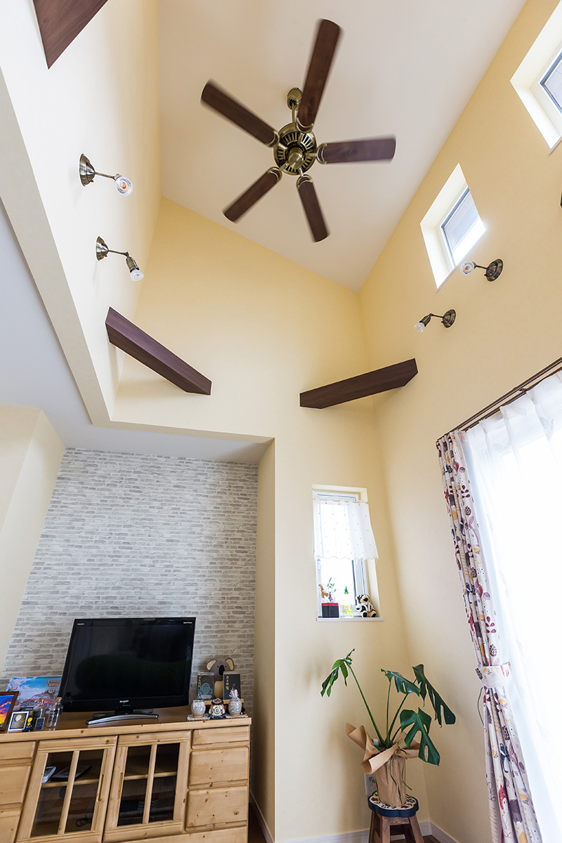 - 勾配天井と吹き抜けを組み合わせることでより開放感を感じられ、明るい空間になりました。