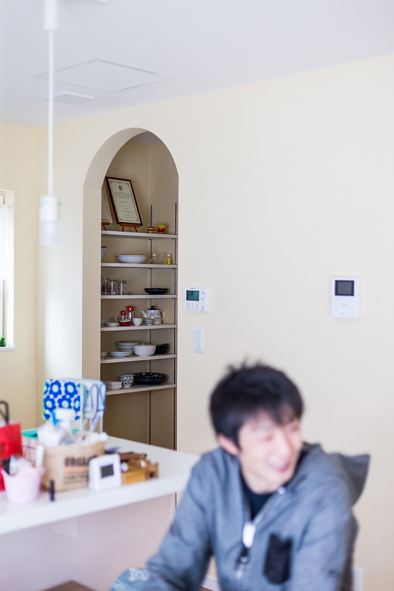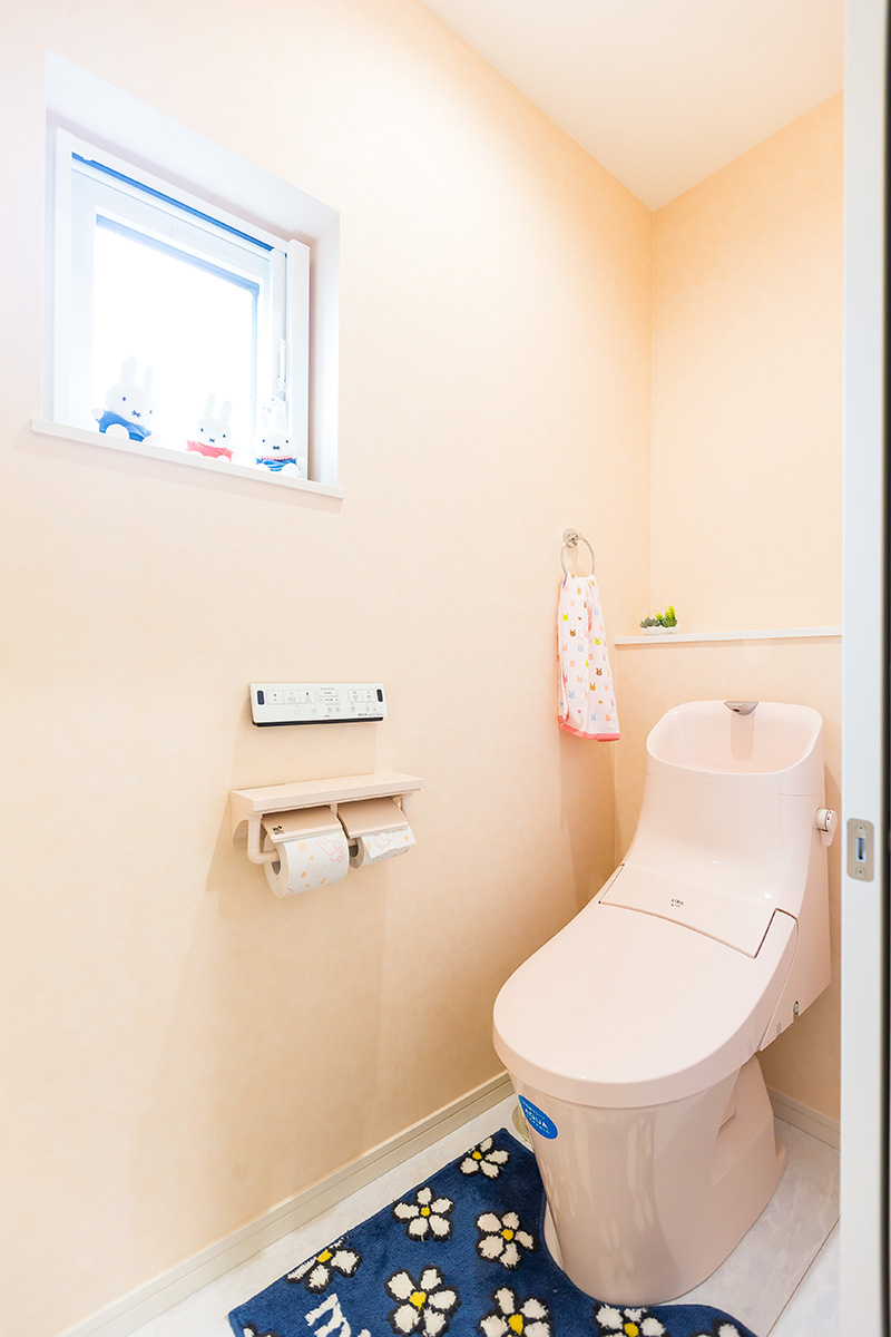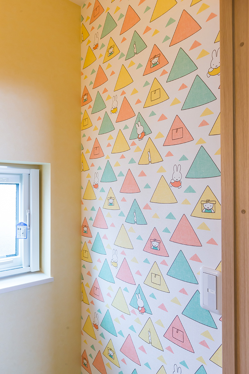 - ピンク色のキッチン、トイレやミッフィーの壁紙など、ご夫婦の好きなものが詰まった優しい印象の内装
