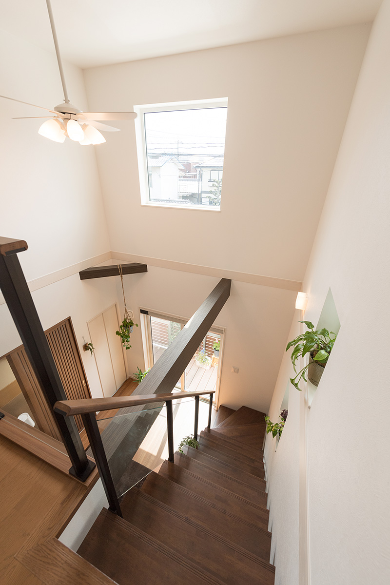 - 吹き抜けに伸びるスケルトン階段。LDK全体に光と風が通ります。