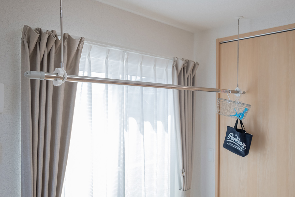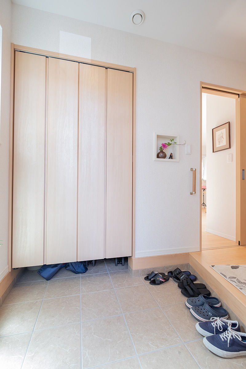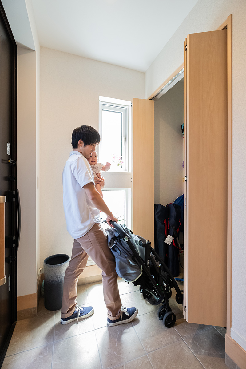 - 玄関はベビーカーごと入れるゆとりのある広さ。抱っこしながら片手でしまえる大容量収納付きです。