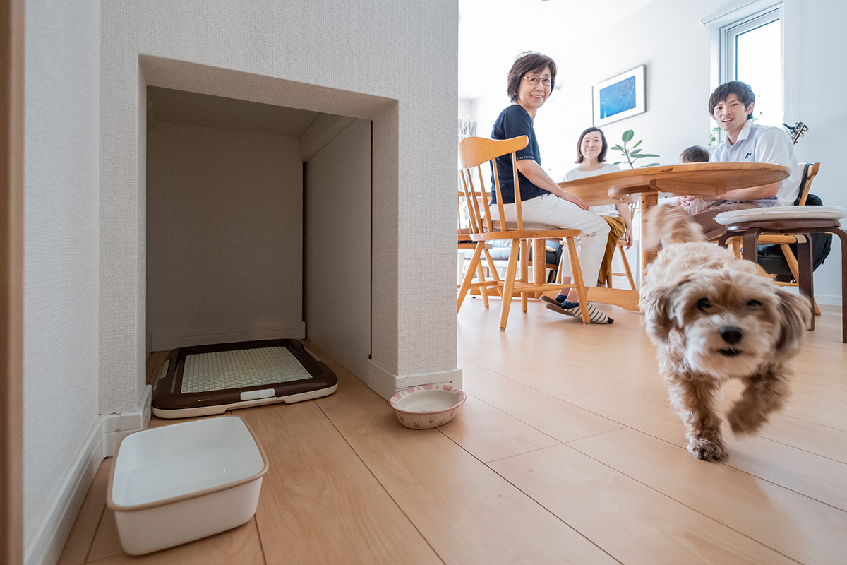 - クローゼットの一角に設けたワンちゃん用スペースはトイレグッズの収納にぴったり。