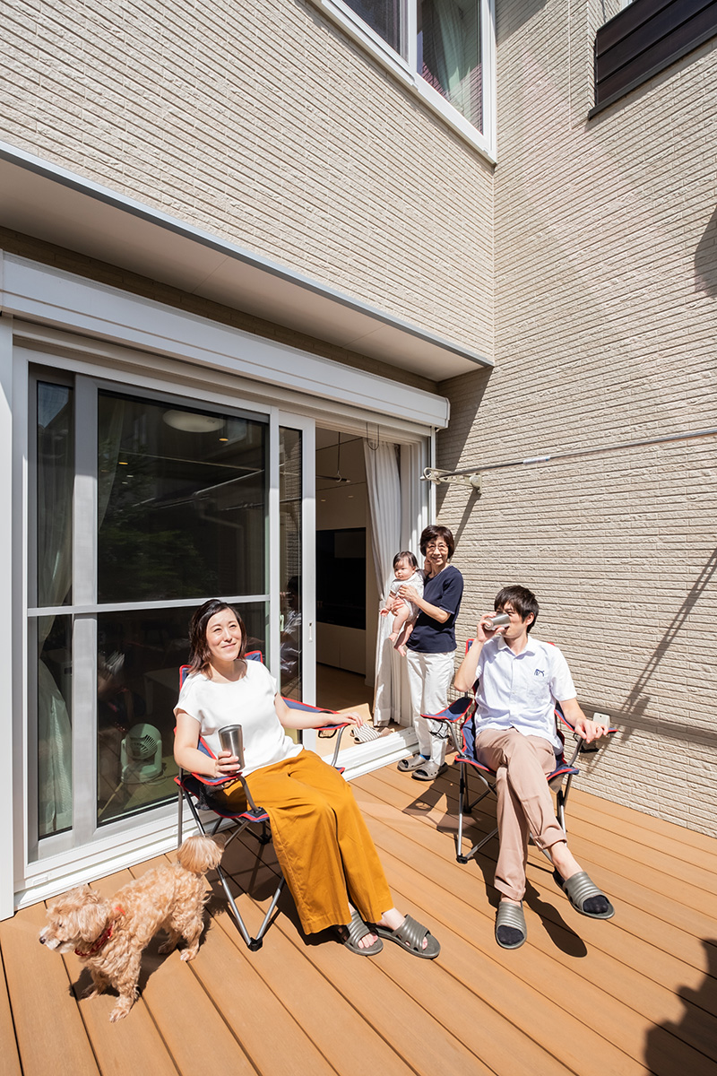 - 1階のウッドテラスはリビングと一体になり屋内に明るさと開放感が生まれます。