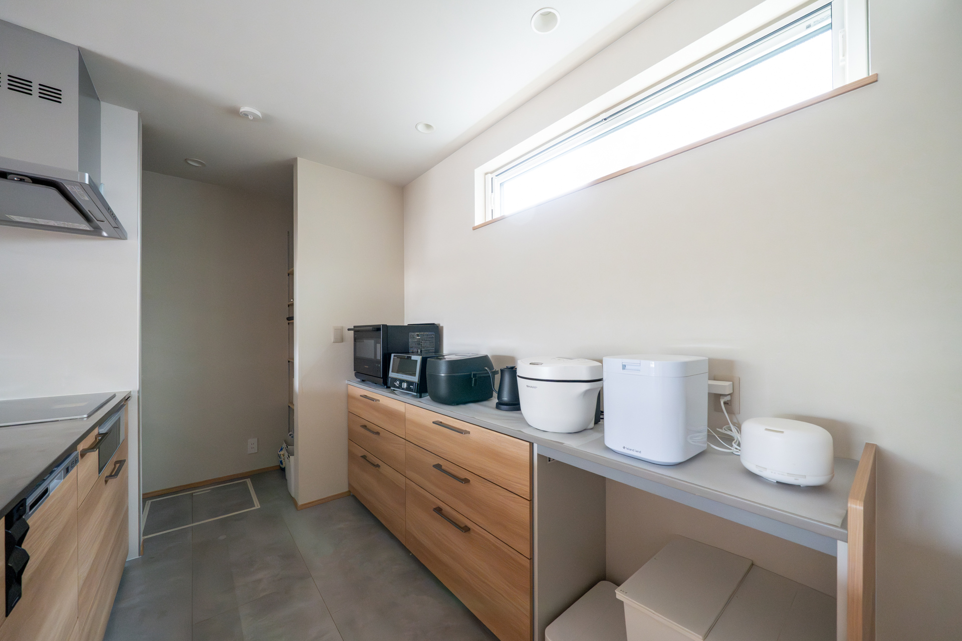 - 幅広カップボード通路で家族3人並んで調理が可能