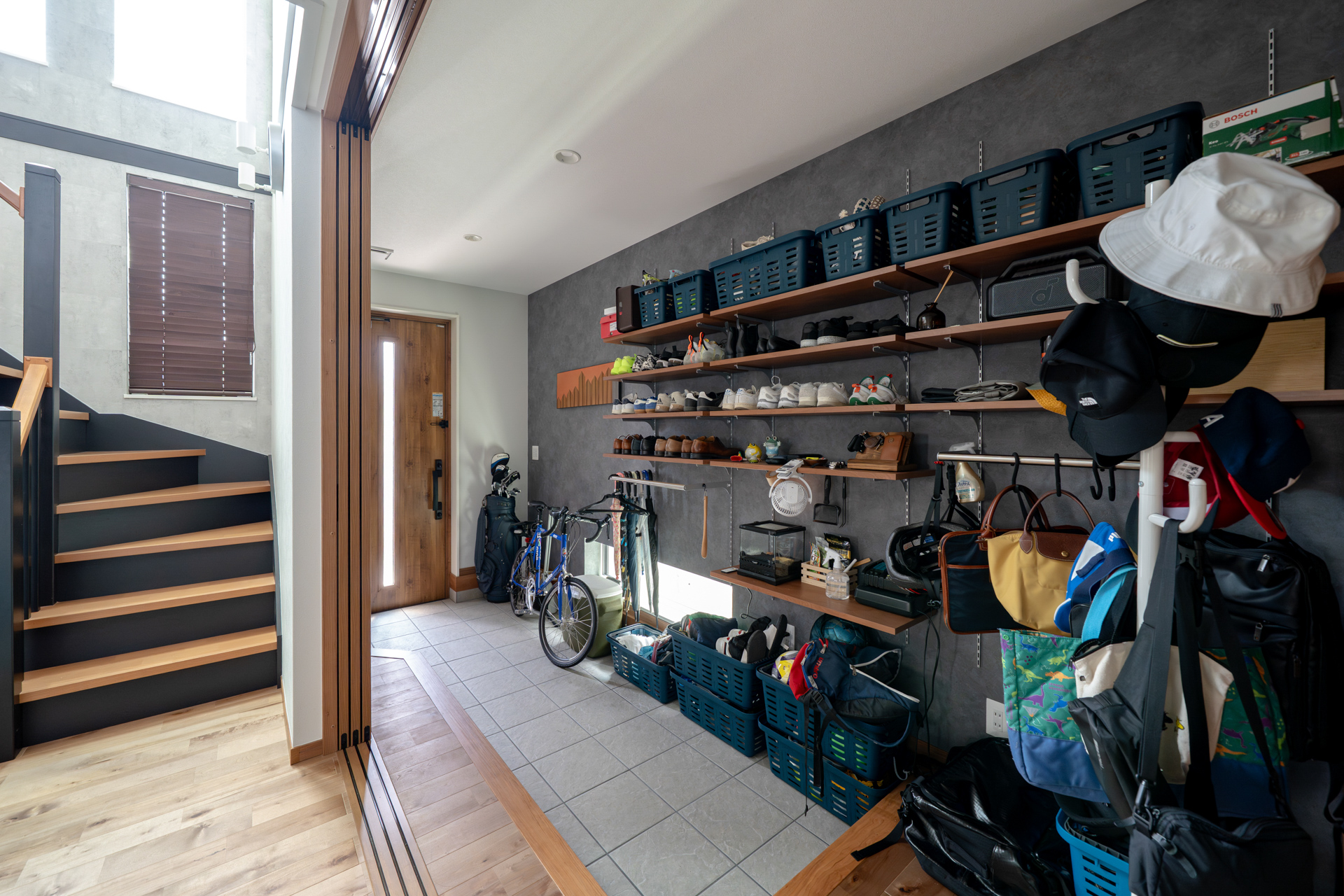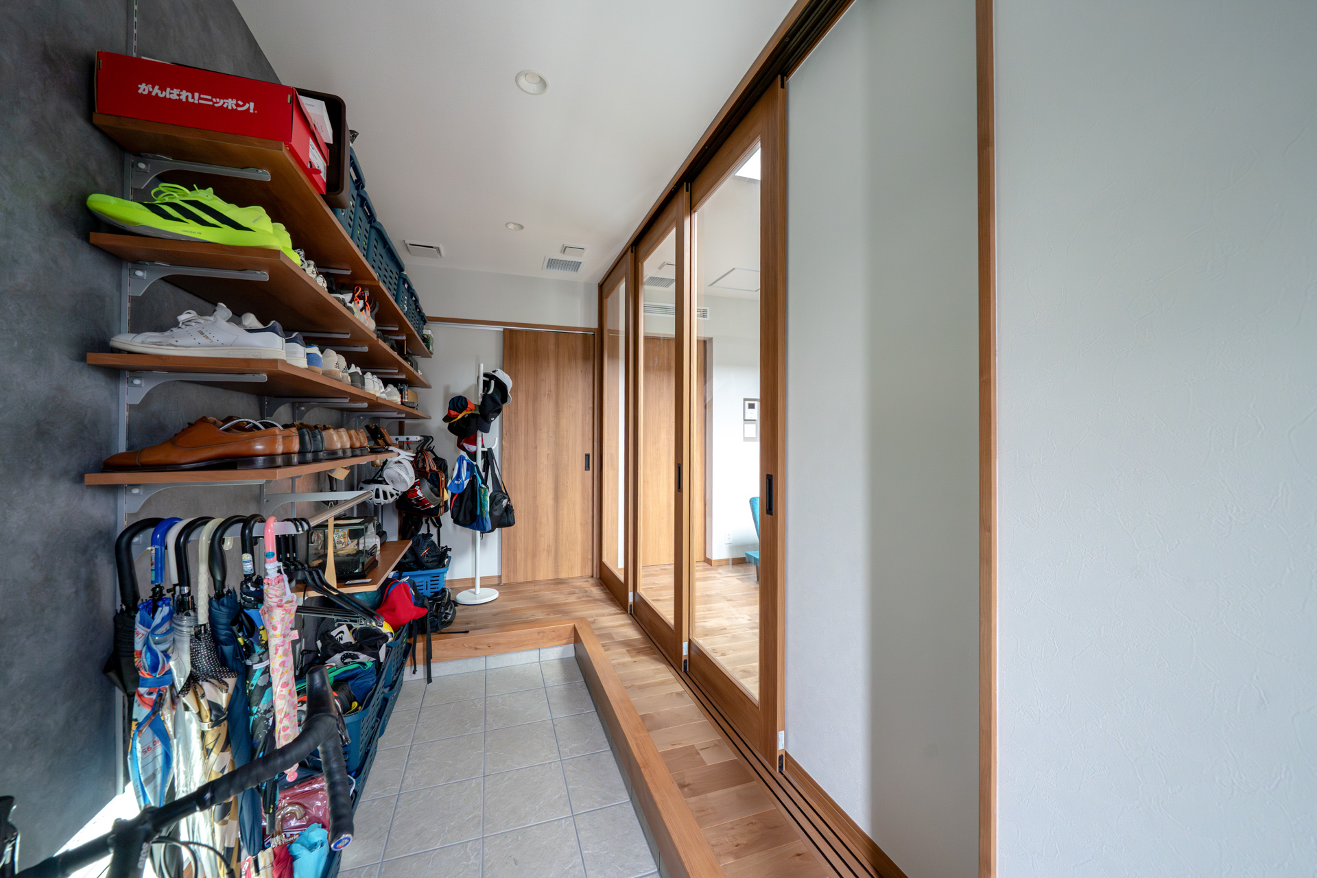 - 帰宅時や外出時の混雑を解消。家族4人でも広々と使える開放的な土間玄関