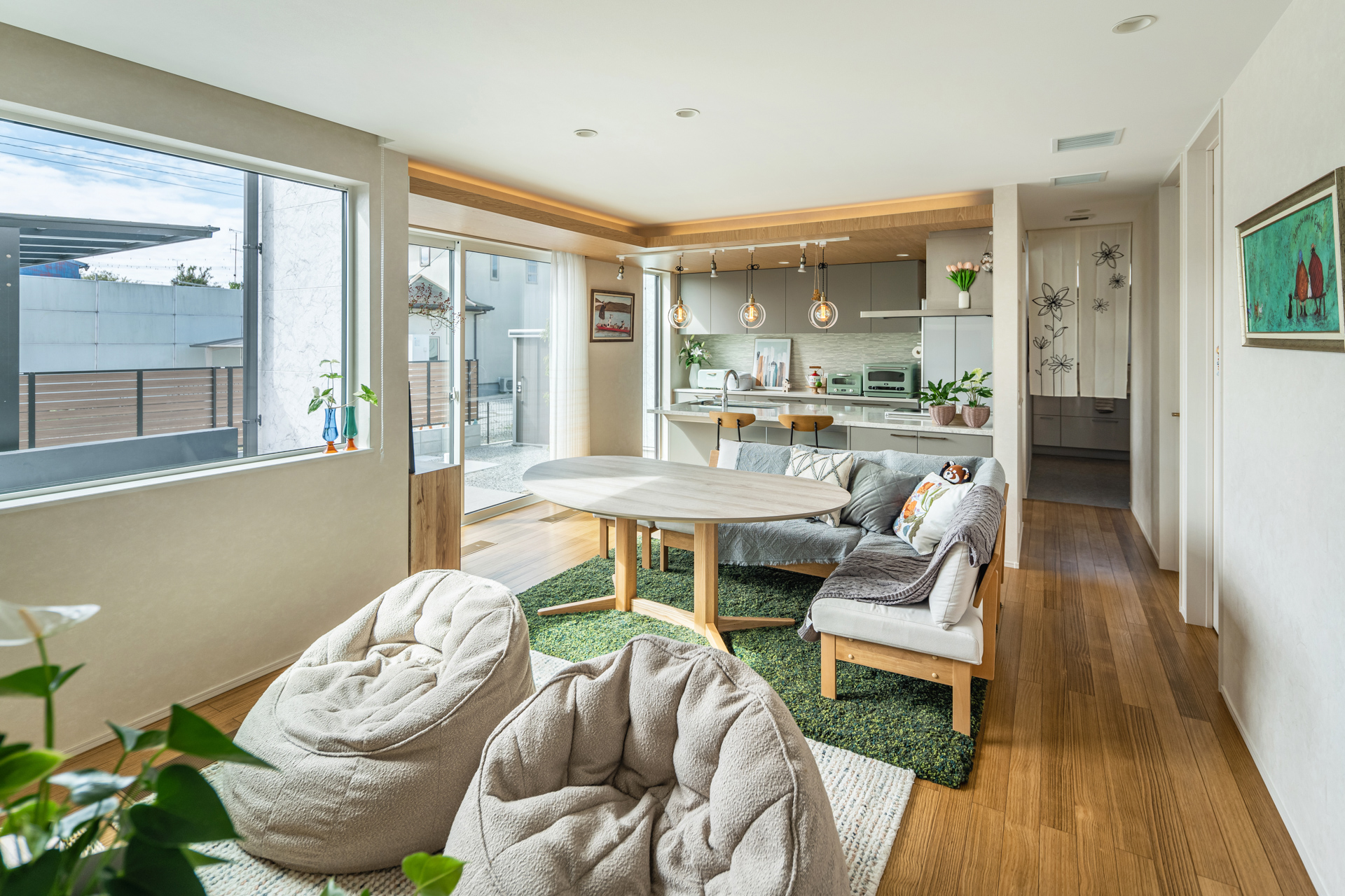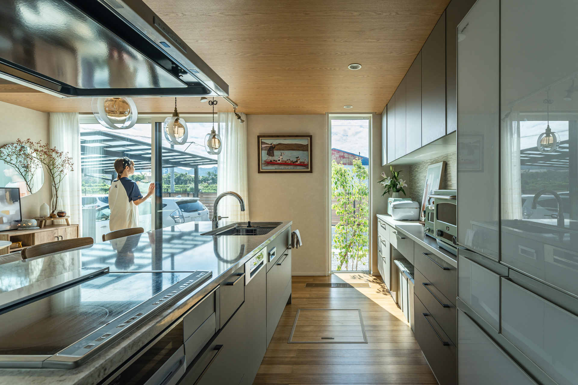 - デッキテラスでBBQを想定し、キッチンからすぐ出られる動線のLDKに