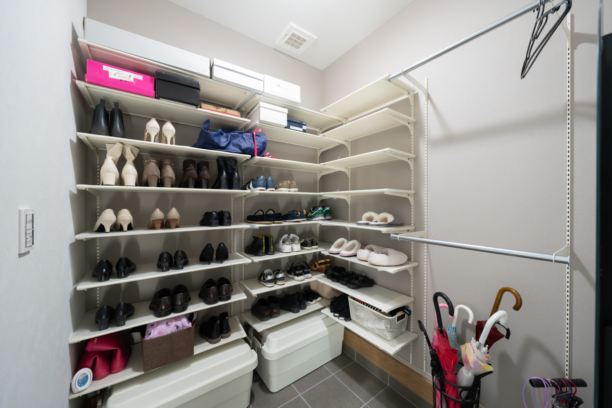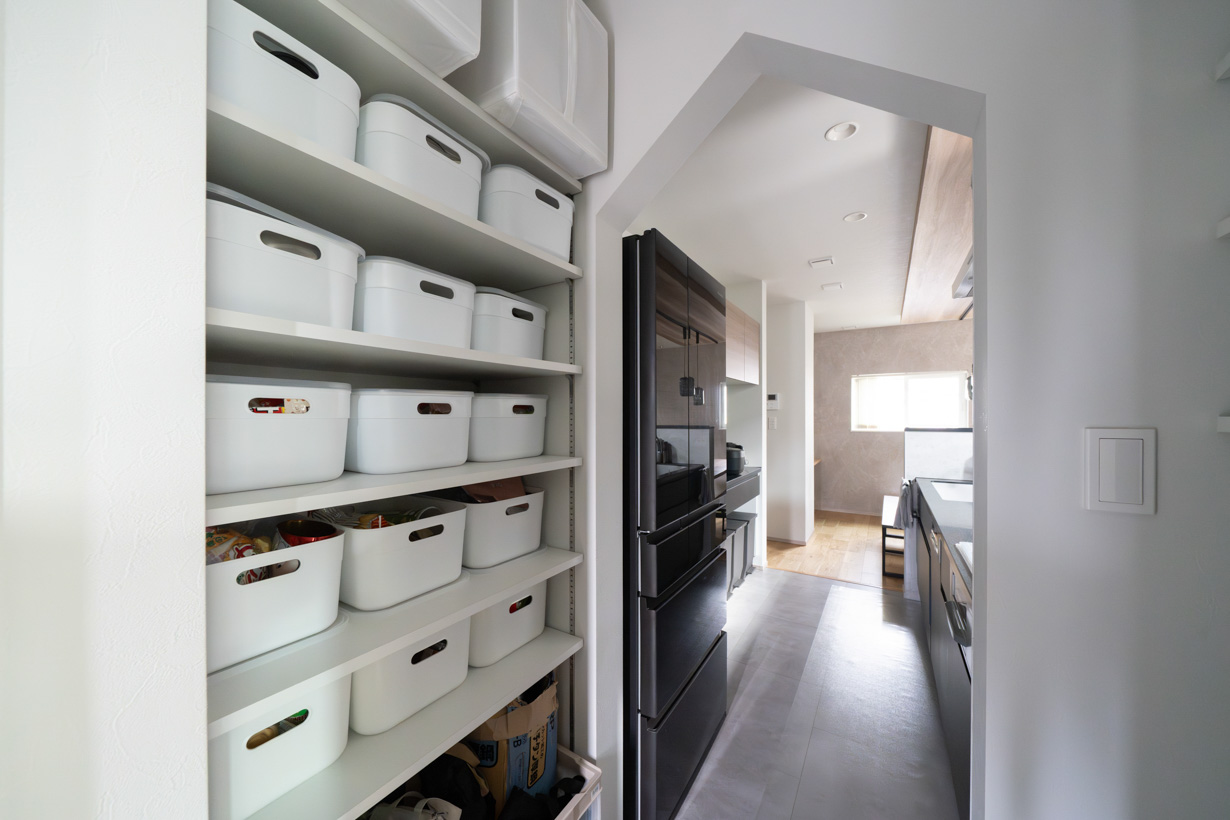 - まとめ買いが多いことを考慮し、玄関入ってすぐにパントリーを設置
