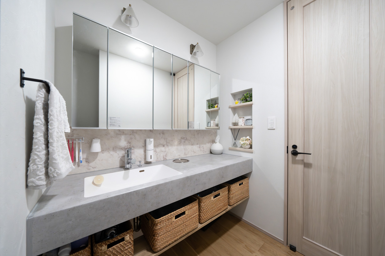 - 帰宅後すぐにお風呂に入れるよう、洗面所と脱衣所を分けた効率的な動線
