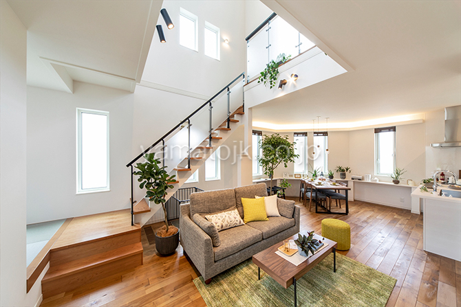 - 吹き抜けと窓からたくさん光を採り込むLDK。落ち着いた色合いの無垢床が明るい空間を引き締めます。間接照明やグリーンがインテリアのアクセントに。天気がいい日は中庭に出たり、おしゃれなカフェにいるような気分にさせるおしゃれな空間です。