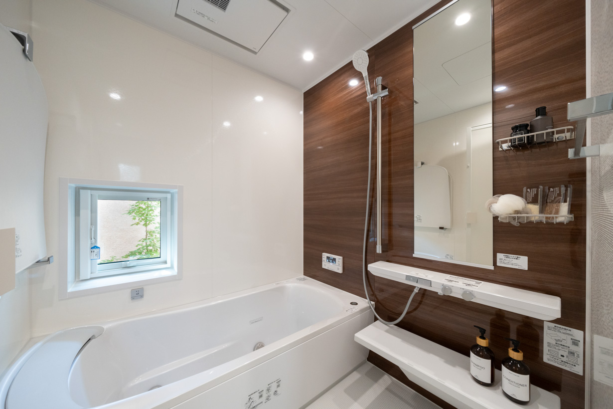 - 脱衣・洗濯・収納など効率的に家事動線を配置した水回りスペース。脱衣室と洗面所を分けることで、家族の入浴を気にせず洗面台を使用できます。