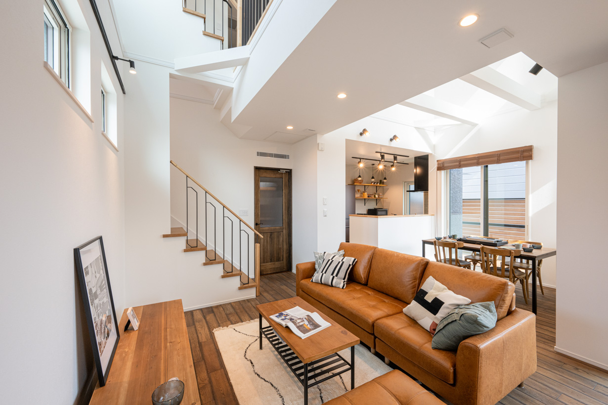- 約20帖のLDKは、2つの吹き抜けから光が注ぐ、帖数以上の広さを感じるスペース。窓から光差し込む明るい空間です。