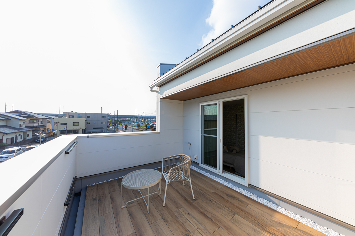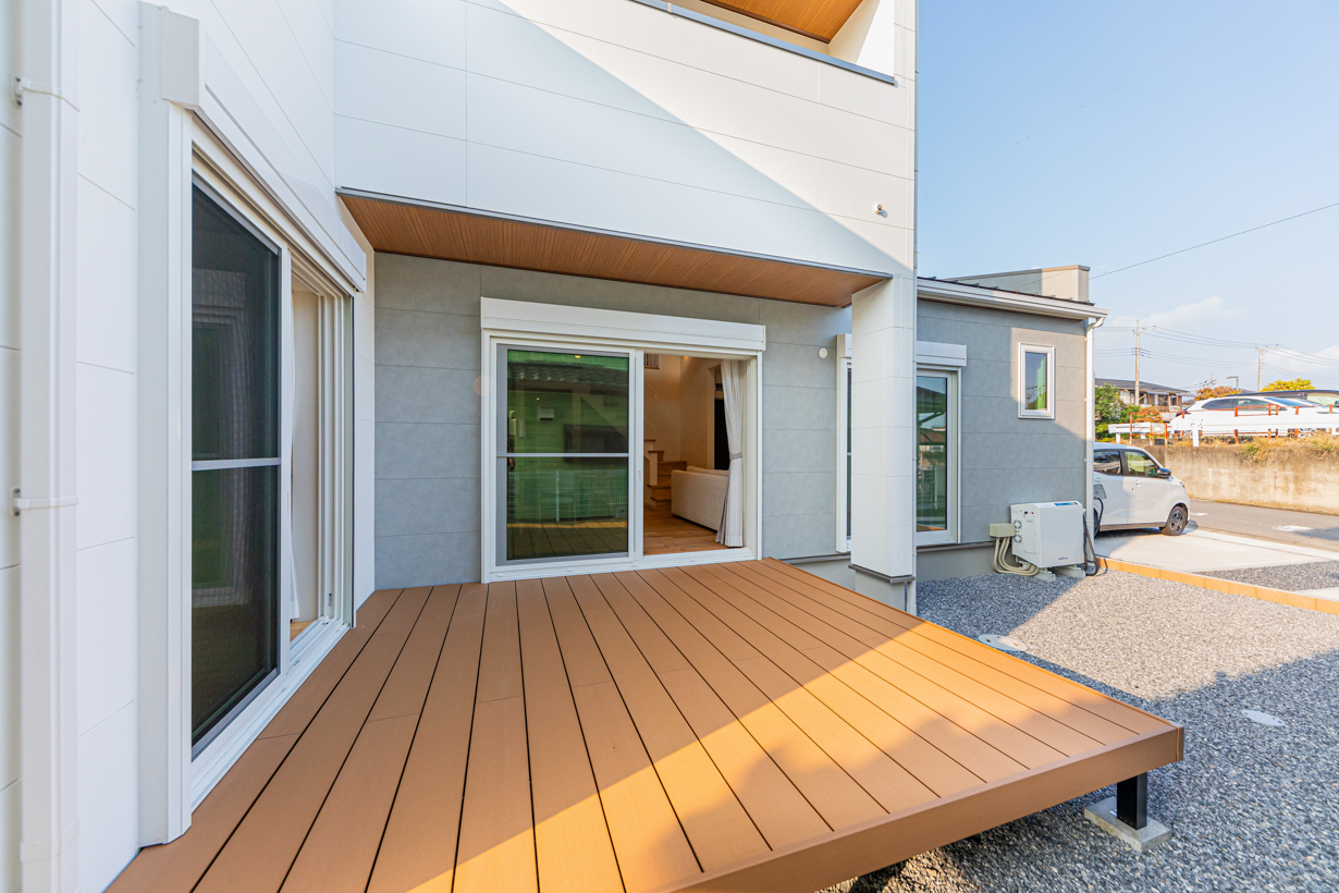 - LDKと繋がる大きなウッドデッキは、子どもの遊び場としてはもちろんのこと、BBQやプールなどおうちレジャーを楽しめます。