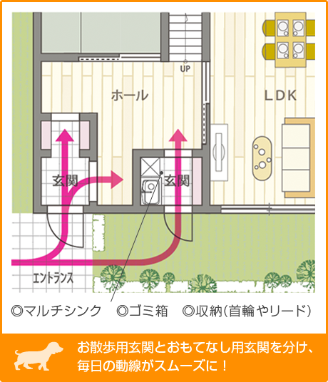 お散歩用玄関を設けて、マルチシンクやゴミ箱を置くのも良いでしょう。散歩から帰るとそのままマルチシンクで足を洗い、室内へ。