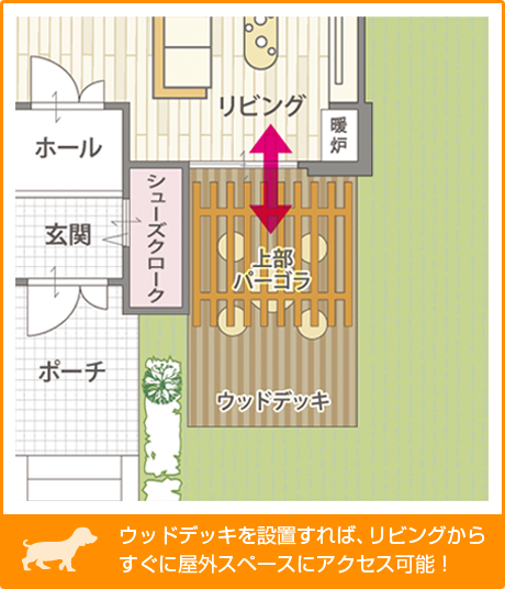 室内からすぐに外に出られるウッドデッキは、家族とのコミュニケーションも取りやすく、休日にはBBQをしながらみんなでわいわい過ごしたり、日よけのパーゴラとハンモックを設置してワンちゃんとのんびりお昼寝もいいですね。散歩に行けない雨の日のストレス軽減にもなります。室内に犬用のスペースを確保できない場合にも良い方法です。