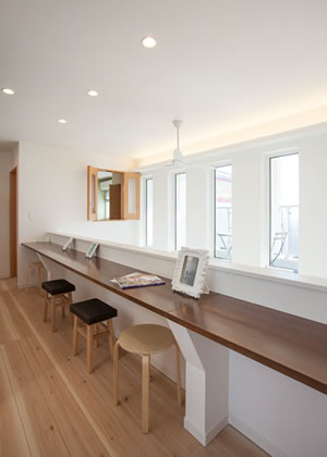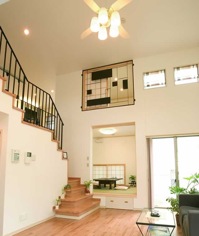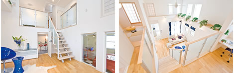 大きな吹き抜け空間を実現できます。吹き抜けに面した2階ホールにカウンターを設ければコミュニケーションの場としても最適です。