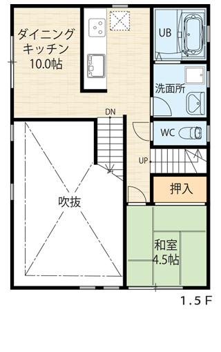 1.5階にはキッチン、ダイニング、和室など、家族の生活空間を集めました。