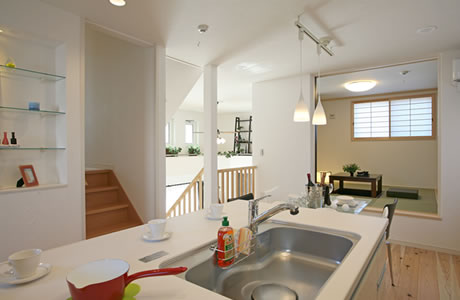 家族みんながキッチンに集まれるオープンキッチン。和室やキッズカウンターなど、ママのいるキッチンをパブリックスペースの中心に。