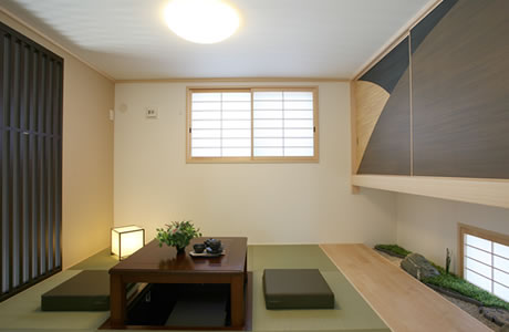 ホッとひと息つける落ち着いたトーンの和室は、家族のくつろぎスペースにも、来客時にも便利ですね。0.5階フロアや1.5階フロアにおすすめです。