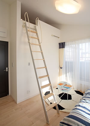 隠れ家のようで心が弾むロフトは多彩な用途で使用できます。低めのロフトは書斎スペース、高めのロフトは子ども達の遊び場に。