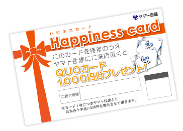1ご紹介していただいたご友人・知人の方が、【ハピネスカード】をヤマト住建の各ショールームにお持ちいただくと、QUOカード1,000円分プレゼントさせていただきます。