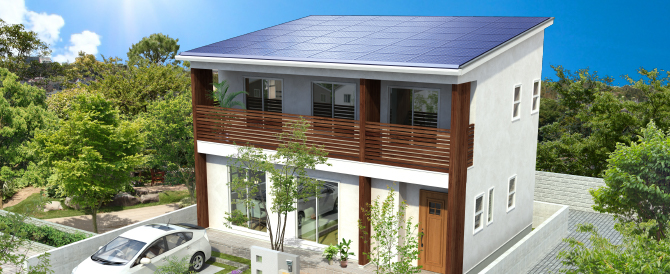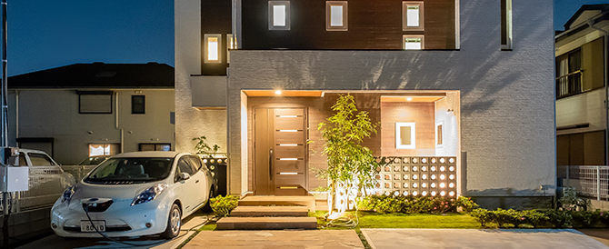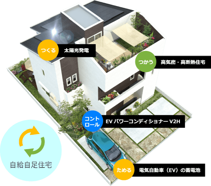 これまで実績を積み重ねた「高気密・高断熱住宅」の技術をベースに、太陽光発電システムと電気自動車(EV)搭載の「蓄電池」を住宅で活用する『V2Hシステム』を採用することで、正に文字通りの「自給自足」を実現しています。