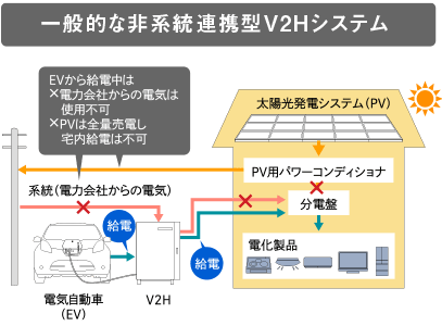 また、停電時でも「電気自動車+V2H※」で通常時にあらかじめ使用する電化製品を特定することなく、住宅用分電盤を通じて家庭内の通常コンセントで電化製品が使用できます。