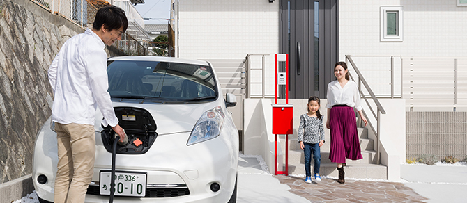 これまで実績を積み上げてきた「高気密・高断熱住宅」の技術をベースに、太陽光発電システムと電気自動車(EV)搭載の蓄電池を活用する「V2Hシステム」を採用することで電気を自給自足化し、化石燃料を燃やさない地球環境に貢献できる住まいが実現します。