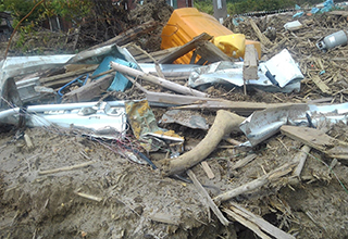 ボランティア活動 ボランティアスタッフとして土砂の撤去作業に参加させて頂きました。道幅が狭く、重機が入れないような場所でしたが、6~7メートル程の山積みになった土砂を手作業で運搬しました。 |