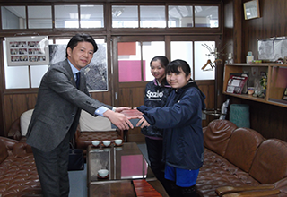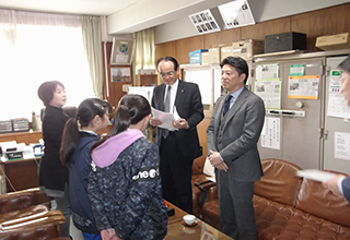 ▲2019年1月18日、地域寄贈型銀行保証付私募債「学び応援債~未来への絆~」発行記念寄贈式(弊社代表取締役社長 中川、星和台小学校 山下教頭先生、四国銀行 執行役員 神戸支店長 須賀様)