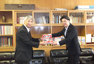 (右写真左側)岡山市立西小学校 牧平校長先生、(右写真右側)弊社代表取締役社長 中川