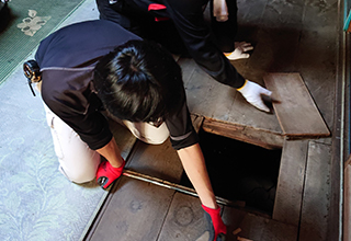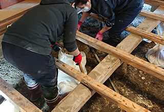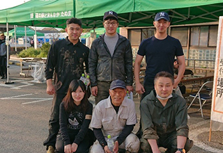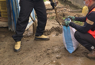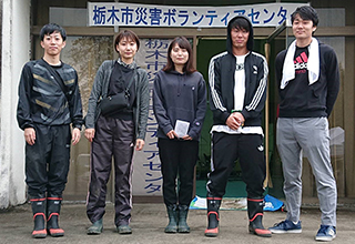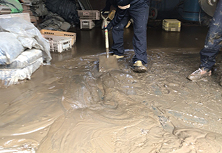 ボランティア活動 ボランティアセンター受付後、被害に遭われたお宅の倉庫及び畑に流れ込んだ泥出しの作業を行いました。 |